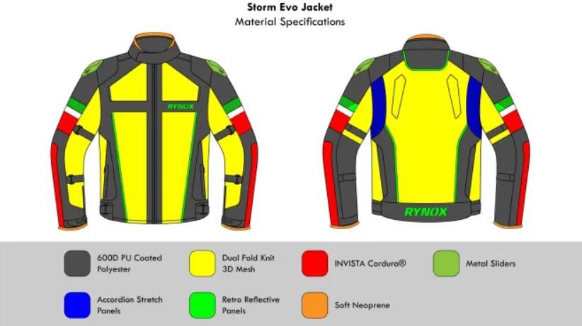 Chest: HD EVA foam protectors (Upgradable to Rynox Cerros CE Level 1 certified protectors) click here